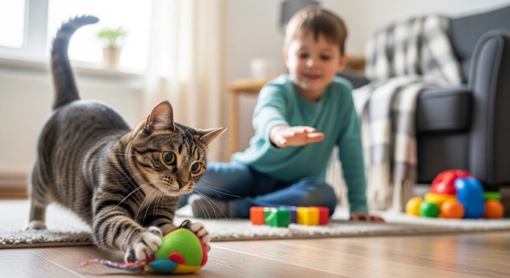 - Brincadeiras Seguras: Use varinhas e brinquedos para que a criança brinque com o gato a uma distância segura, evitando arranhões.
